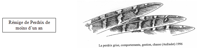 Lorsque les rémiges sont pointues il s’agit d’une perdrix sub-adulte et lorsqu’elles ont un aspect plus arrondis il s’agit d’un oiseau adulte. (Voir schéma ci-dessous)