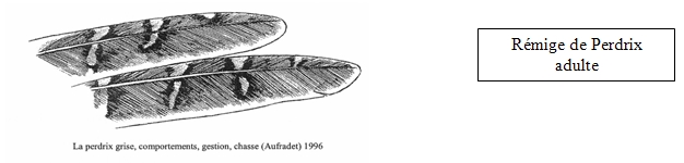 Lorsque les rémiges sont pointues il s’agit d’une perdrix sub-adulte et lorsqu’elles ont un aspect plus arrondis il s’agit d’un oiseau adulte. (Voir schéma ci-dessous)