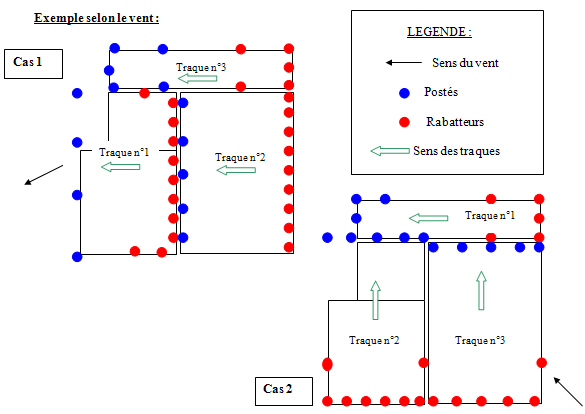 Afin d’éviter des doubles comptages, il est important d’avoir une stratégie dans l’organisation des traques et des instructions. En effet, tous les postés comptent ce qui passe à leur droite et il faut que les traqueurs marchent vent dans le dos. Sachant que la Perdrix grise axe toujours (ou souvent) sa fuite avec le vent dans le dos il est donc important d’orienter les traques de façon à éviter les doubles comptages.