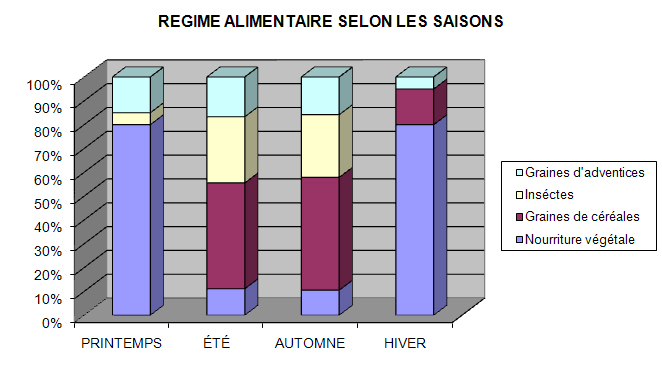 La perdrix grise adulte est prioritairement granivore , mais elles consomment aussi des végétaux (dont de petits fruits et baies), et de petits animaux (vers, invertébrés divers)]. Les 10 premiers jours de vie, le jeune est exclusivement insectivore. D’où l’importance de la présence absolument nécessaire d’insecte en période d’éclosion. Un grand nombre des jeunes mourront avant de pouvoir se reproduire, victime de leurs prédateurs naturels ou de l’absence de nourriture.